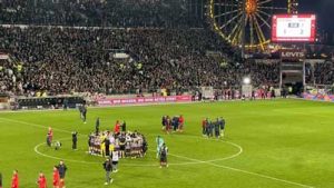 Die erste Hälfte ging ganz klar an unsere Kiezkicker. Der feurige Empfang des Teambusses zeigte Wirkung. Von Beginn an herrschte in den Breisgauer Reihen so etwas wie „geordnete Sorglosigkeit“, die alsbald bestraft werden sollte. Selbst das langsamste Kinderkarussell und das Riesenrad nebenan auf dem Dom (der weg muss!) legten mehr Tempo vor als die Freiburger. Zwischendurch meldet Kollegin Svenja: „Schöner Wechselgesang zwischen beiden Fangruppen mit ‚Scheiß DFB!‘ und ‚Scheiß DFL!!‘“. Chapeau!