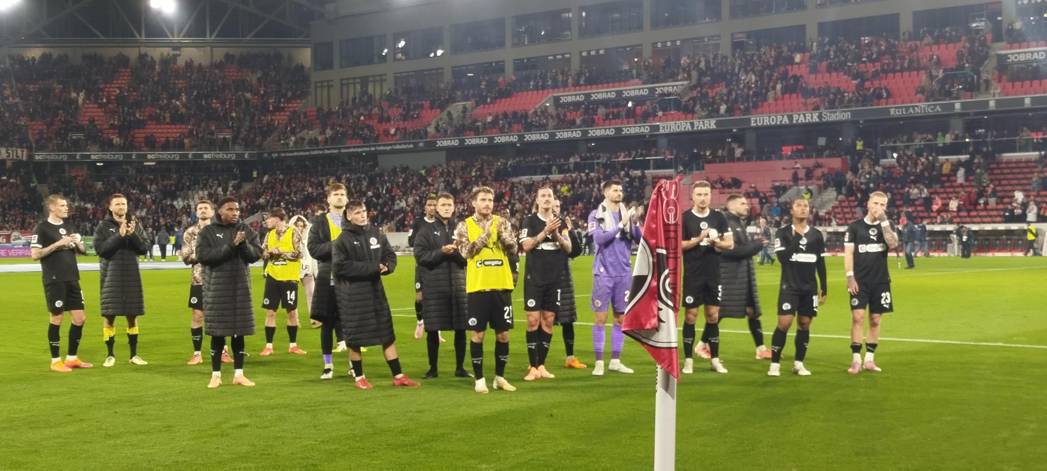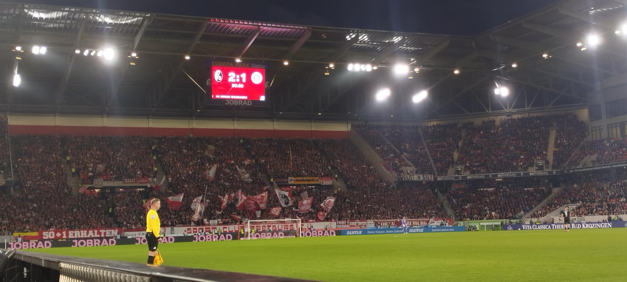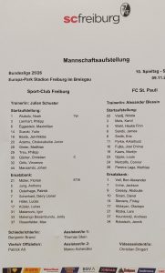 Zunächst sah es allerdings ganz gut aus. Unsere Boys in Brown (heute in Schwarz?) gegen die Freiburger in Weiß. Vasilj parierte in der 14. und 27. Minute zweimal perfekt. Nach einem Eckball gingen die Gastgeber dann aber durch Suzuki (ich hatte mal eine GT 550…) in Führung (40.). Kurz vor der Pause „der psychologisch wichtige Zeitpunkt“. Scheiß Psycho-Mist