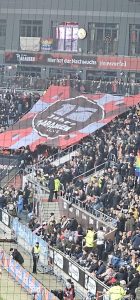 FCSP-Trainer Alex Blessin vor dem Spiel: „Der Support von den Rängen kann ein Faustpfand am Millerntor sein. Deshalb appelliere ich an unsere Fans, dass sie uns wie sonst immer unterstützen“. Und das taten Süd, Nord und Gegengerade. Der Kuchenblock auf der Haupt hielt sich wie üblich leider „vornehm“ zurück.