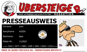 Tim hatte mich freundlicherweise mit dem Vermerk: „Hossa vom Übersteiger (Presse Futzi)“ auf die Gästseliste gesetzt. DaZke dafür! Eilig bastelte ich mir noch einen ÜS-Presseausweis, schnappte mir Kuli und Zettel und auf ging’s zur HVV-Rally. Maximale Freude, als das Ziel erreicht war.
